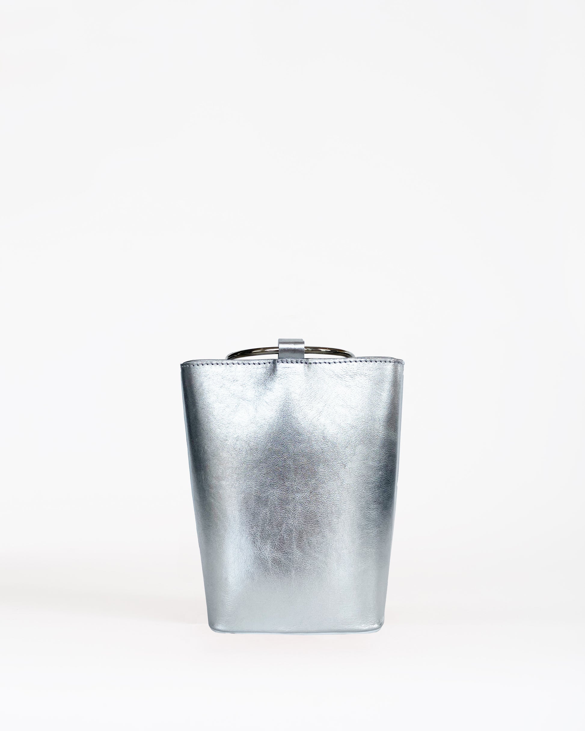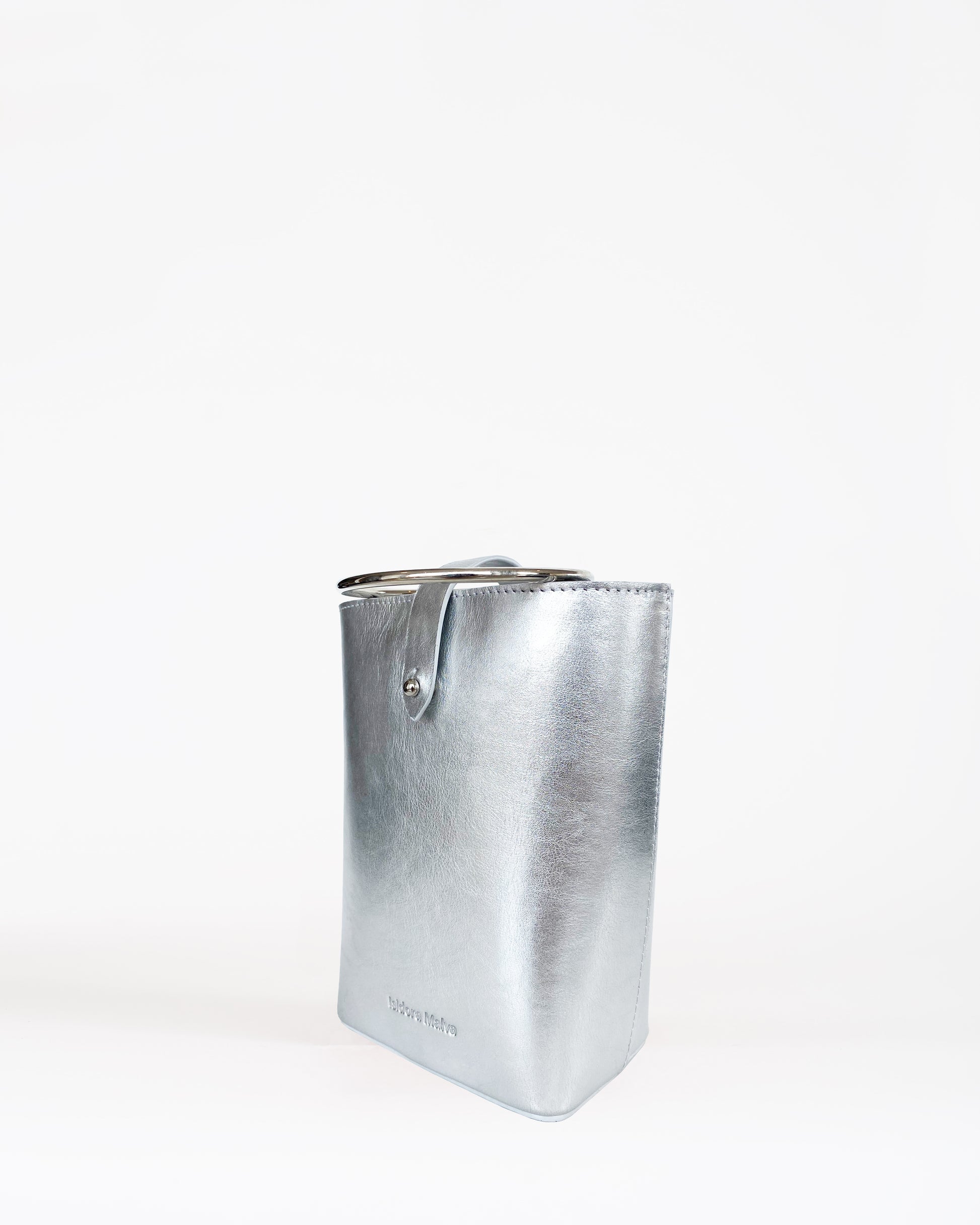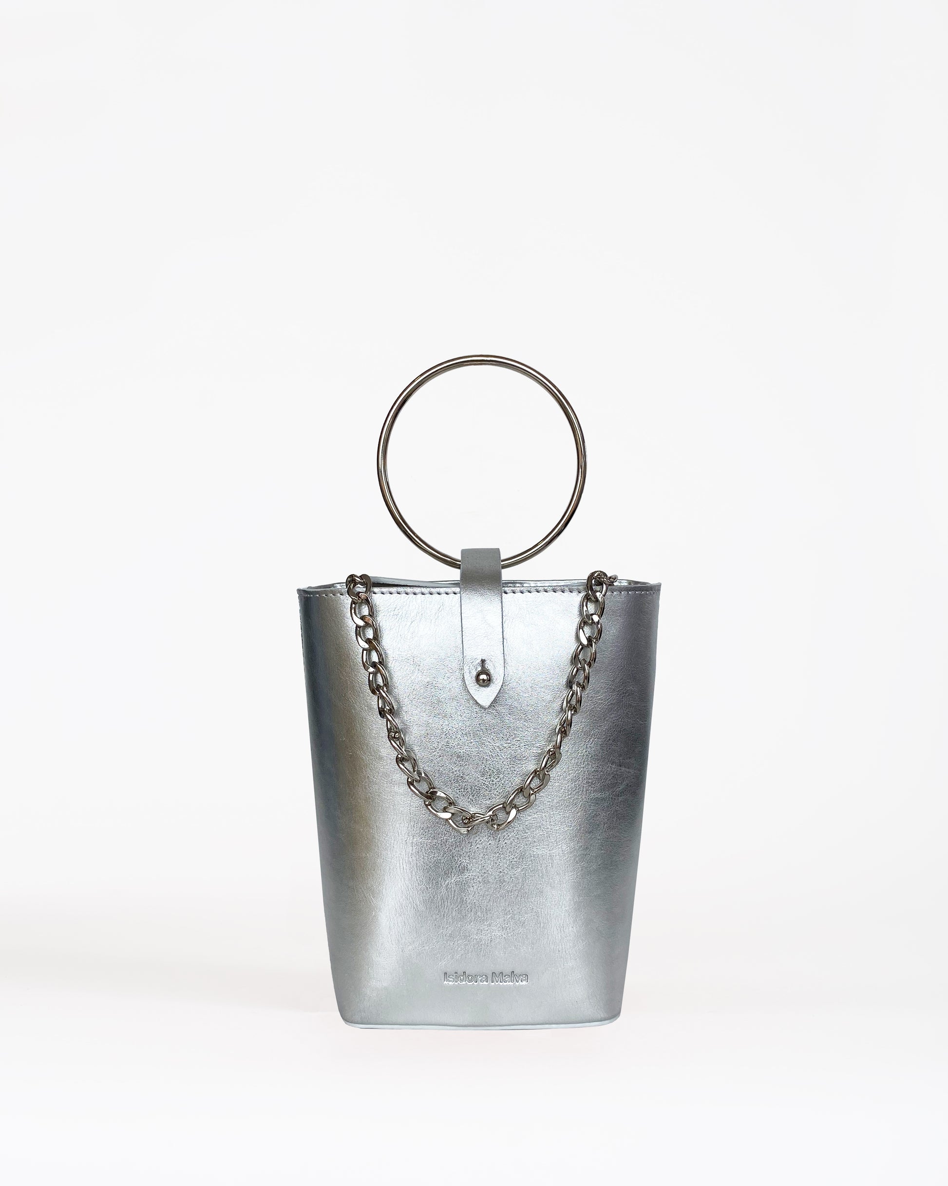 Cartera de mano en cuero plateado con manija en aro, puedes llevarla de mano, en la muñeca o en el hombro con la cadena removible.