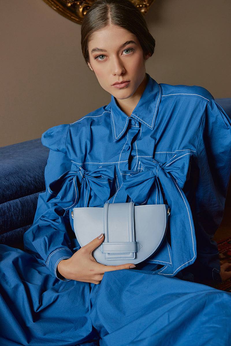 Luna mini hace parte de la nueva colección ESENCIA. Espaciosa cartera de mano en forma de luna con nuestro cierre icónico. Cierre magnético y correa removible para llevar en el hombro.