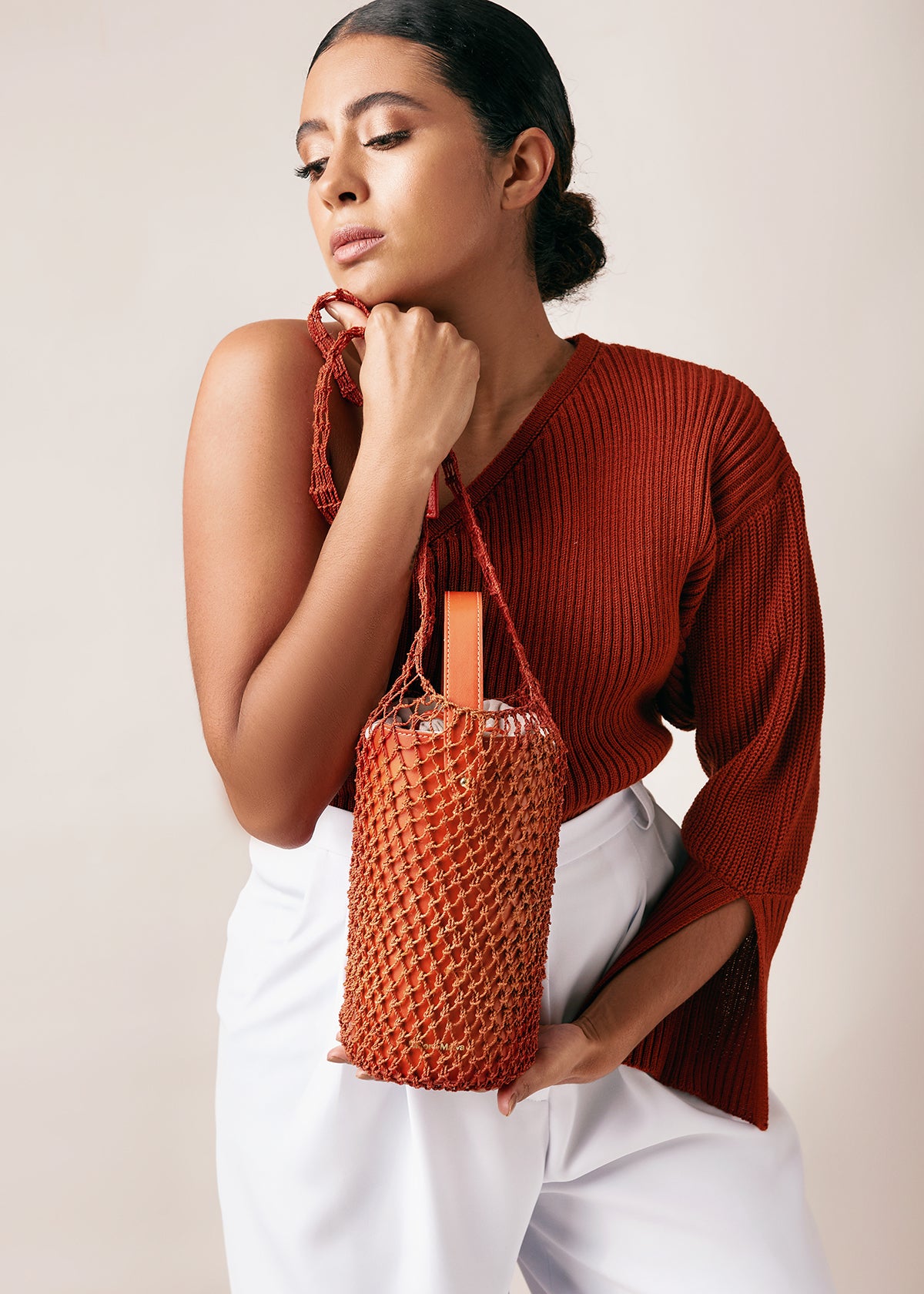 Cartera estilo balde en cuero cubierta por una mochila en fibra de cumare tejida a mano, puedes llevarla de mano, en el hombro con la mochila o solo la mochila.